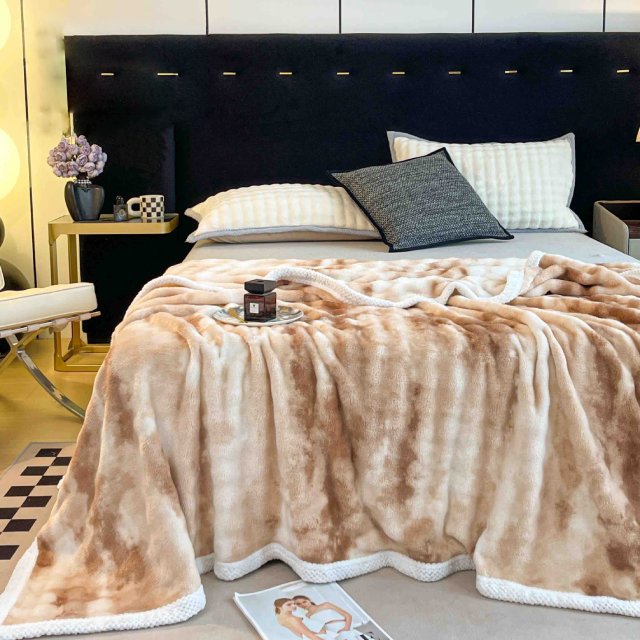 Плюшено одеяло с къс изкуствен заешки косъм – петнисто кафяво – FJ-01