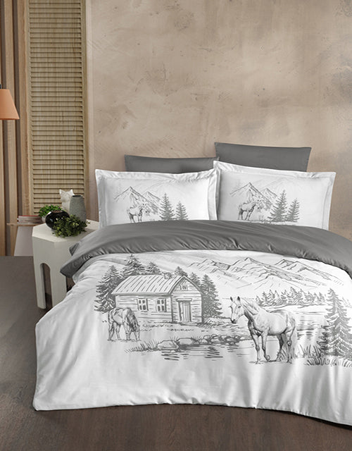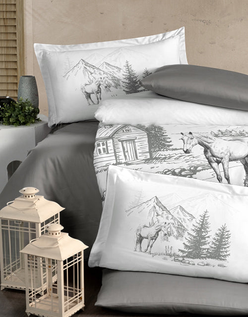 3D Спално бельо от памучен сатен – бяло с коне и планини – 3D-63