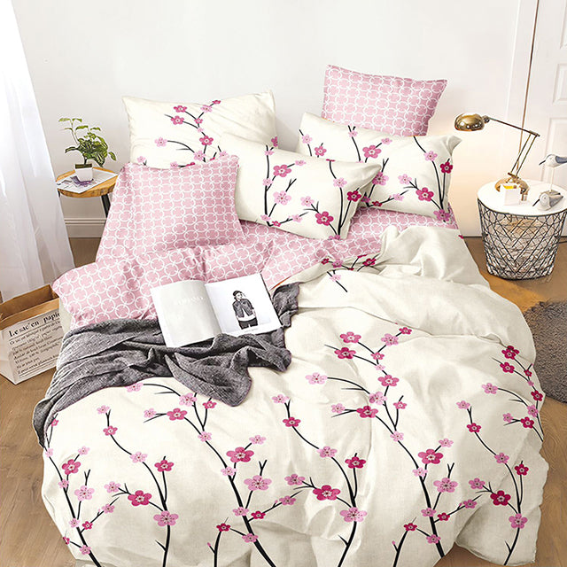 Спално бельо от поликотън – бяло с клонки с розови цветя – A50-551